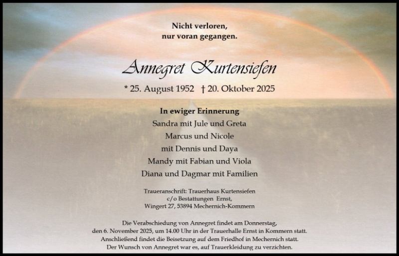 Liebe Anne...❣️ Ich hab's leider heute erst erfahren 😊😳😢 mein schwacher Trost ist, das es dir jetzt besser geht. Mach et joot auf deiner WolkeSchaukel.