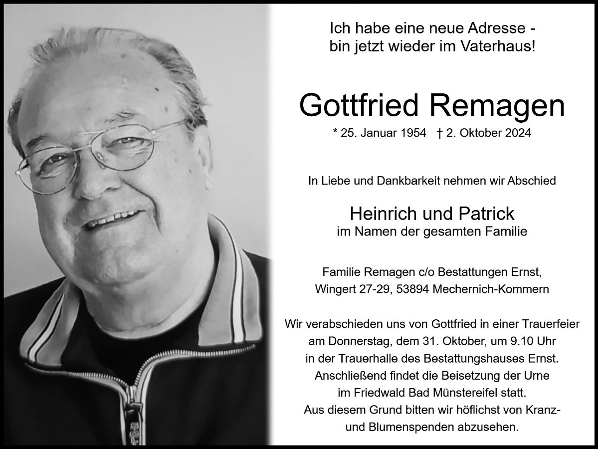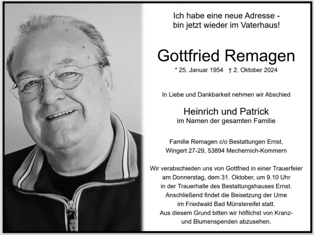 Ich möchte Ihnen danken, dass Sie mir die Traueranzeige zugeschickt haben. Leider kann ich aus persönlichen Gründen nicht an der Gedenkveranstaltung teilnehmen, aber meine Gedanken sind bei Ihnen und bei Gottfried. Er war ein besonderer Mensch, der mir viel bedeutet hat, und ich werde ihn stets in guter Erinnerung behalten.