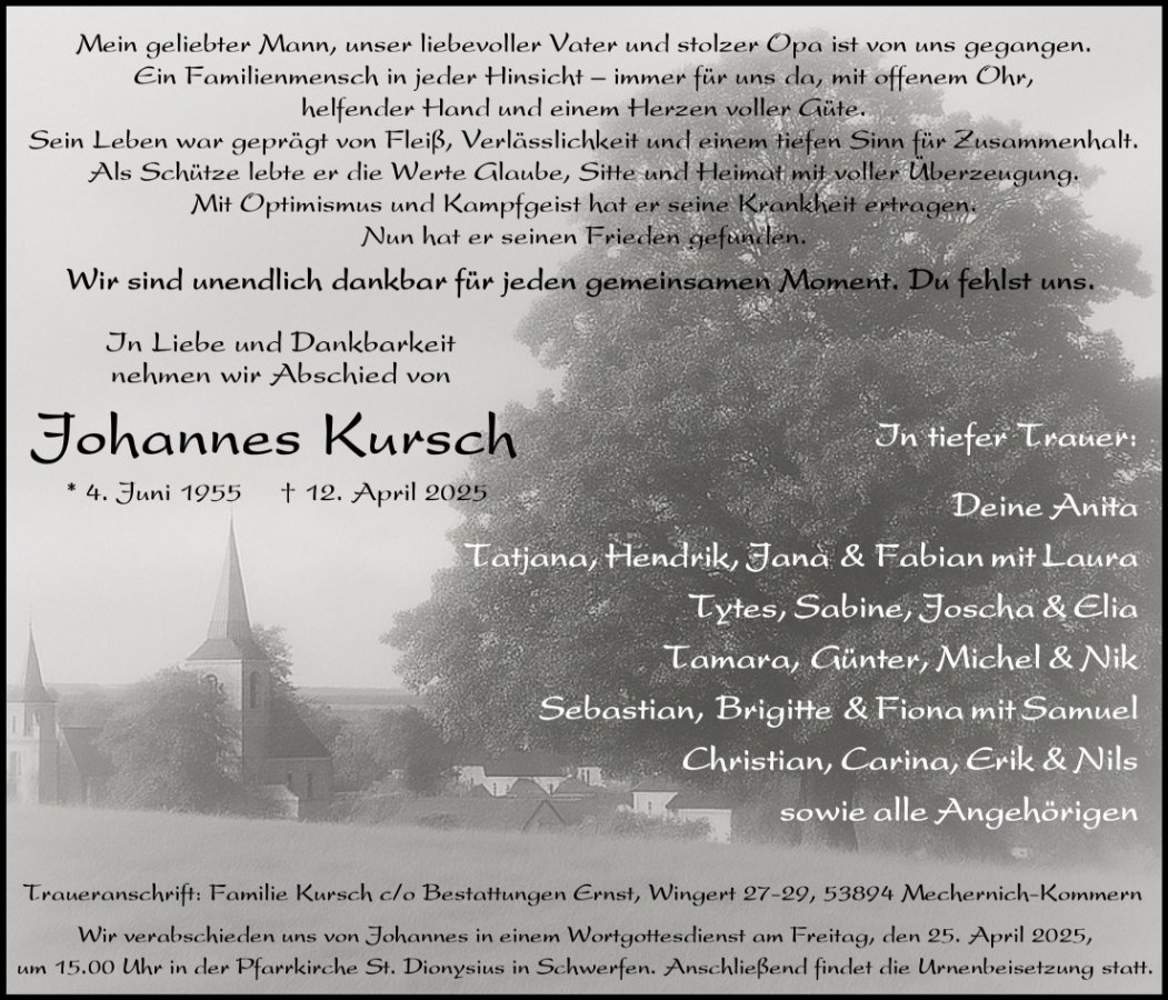 In stiller Trauer nehmen wir Abschied von unserem geschätzten Schützenbruder. Sein Leben war geprägt von Kameradschaft, Ehrlichkeit und unermüdlichem Einsatz für unsere Gemeinschaft. Möge sein Andenken in unseren Herzen weiterleben und uns stets an die schönen gemeinsamen Momente erinnern. Ruhe in Frieden, lieber Bruder."